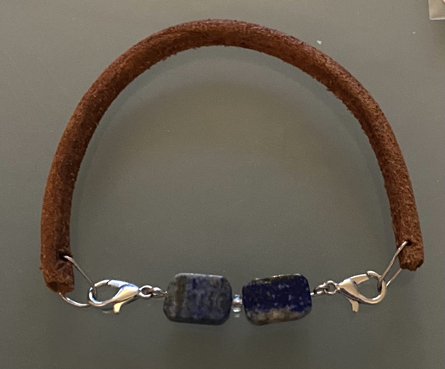 Materiaal: Leren armband met blauwe lapis lazuli kralen en stainless steal haakjes